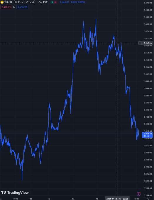 まずは金銀のチャートから、金は2,470ドル→2,400ドル前後まで約70ドル~の下落。