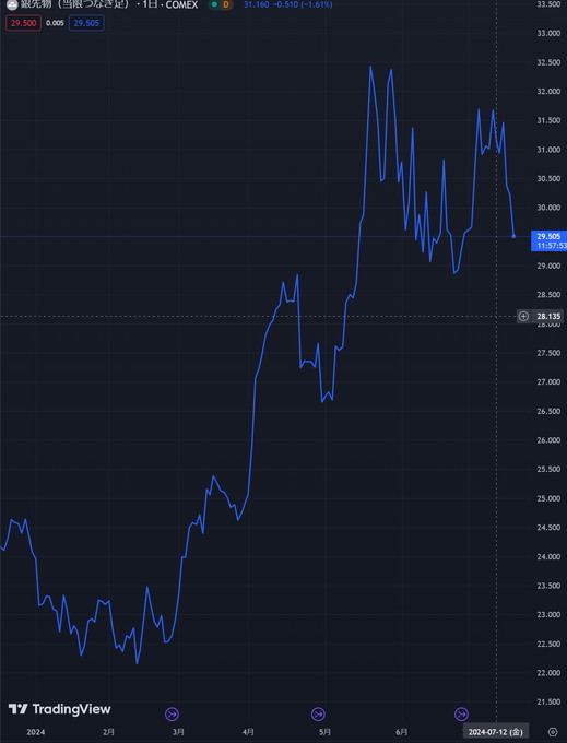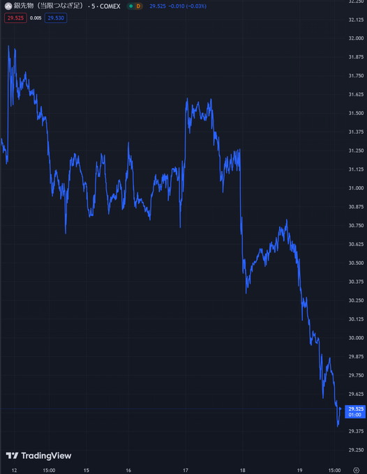 銀に関しても18日には31ドルだったのが、現在は29.3ドルまで下落。銀は6月中旬以来最大の暴落。
