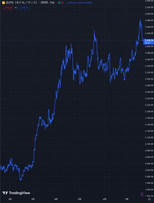 7月初週は2,300ドル台だったのが急上昇し→下落で、現在2,400ドルを持ちこたえている状況です。