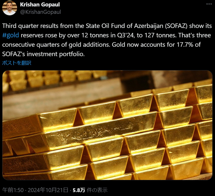4,アゼルバイジャンの国家石油基金2024年第3四半期に12トン以上増加し、127トンとなった。