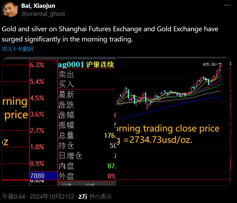 中国に関しても週が開けても強い需要があり、金、銀ともに西側価格よりプレミアムが付いてます。