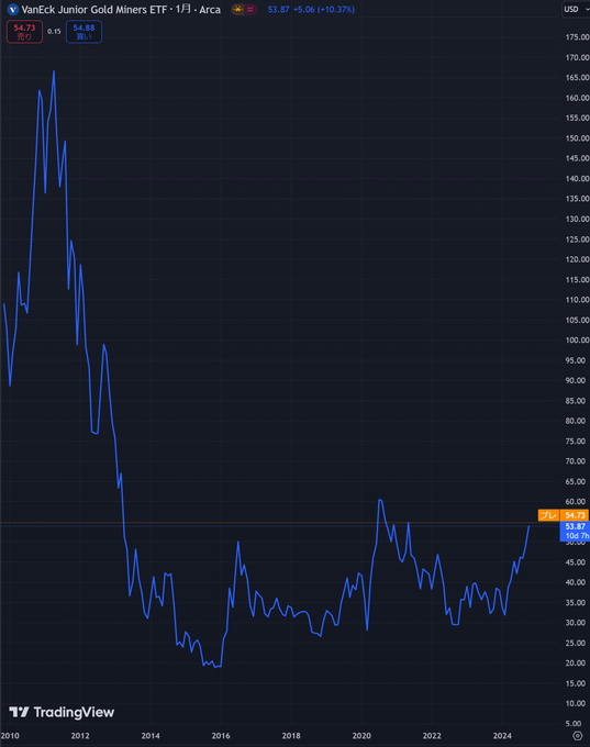 特にジュニア鉱山株であるGDXJは2011年の最高値が166ドル近辺ですが、現在は上昇してきてますが54ドル前後で半値以下です。