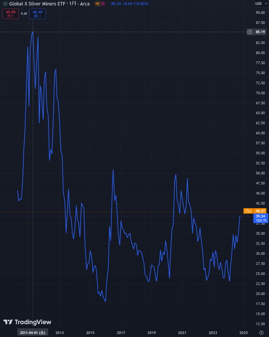 また、SIL、SILJは銀鉱山株ETFですが、こちらも最高値から遠く、SILは最高値85ドルですが現在は40ドル前後。