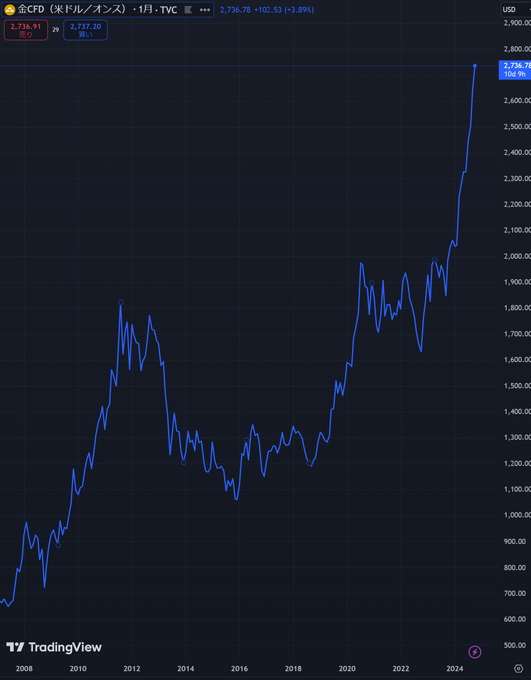 週明けで調整下落あるかなと思いましたが、ゴールドは2733ドルで史上最高値を更新。勢いはまだ全然止まりません。