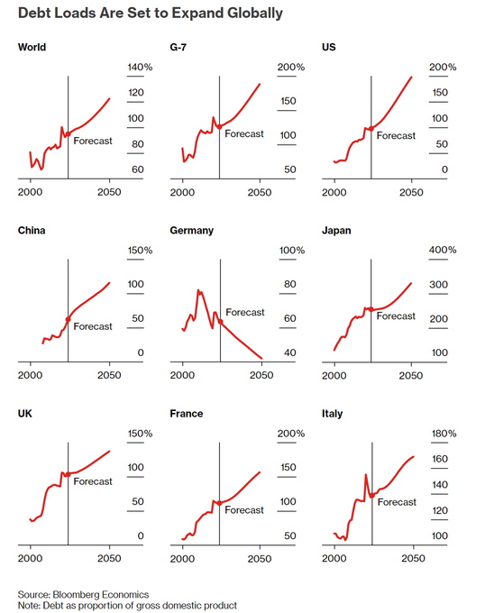 世界債務の増加予想ですが、なぜか増加ペースが緩やかになっており、かなり楽観的な増加ペースに見えます。