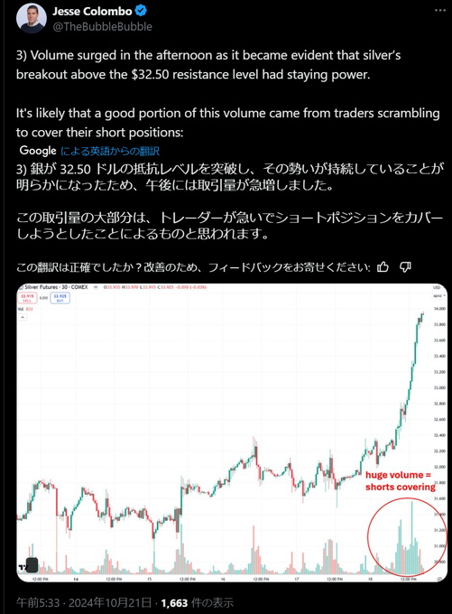 そして、32.5ドルで勢いが止まらなかったことから、ショートポジションを取っている投資家らが、損失を防ぐため焦って銀ショートポジションをカバーの為取引量が急増しているとしています。