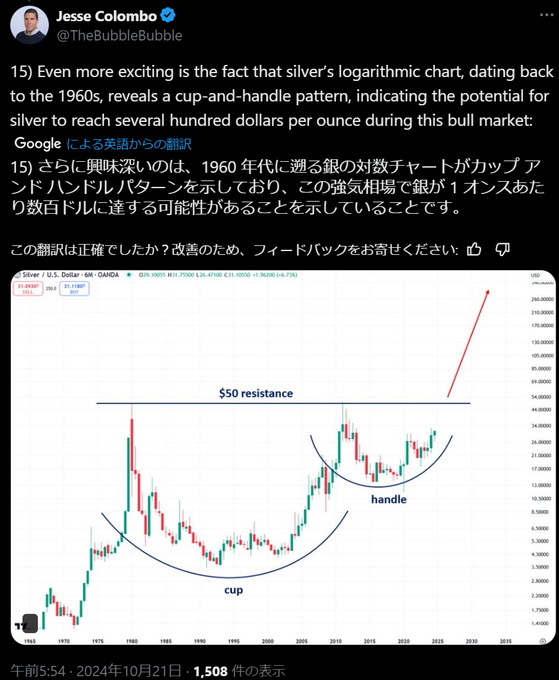 2,コロンボ氏「1960年代銀がチャートがカップ・アンド・ハンドルを形成。1オンスあたり数百ドルに達する可能性がある」