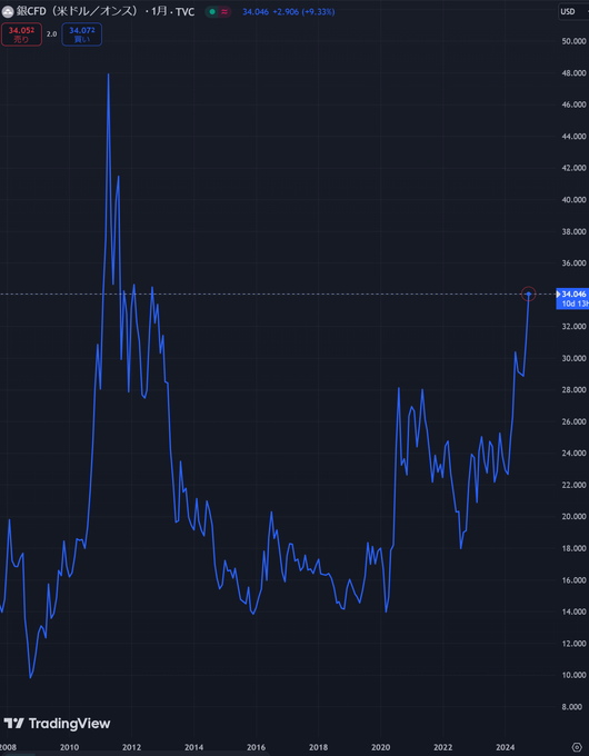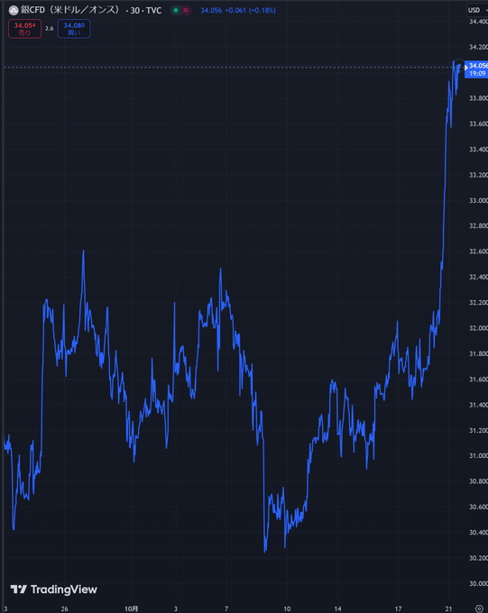 一方、銀は32.5ドルを突破し、34ドルまで急上昇。ただ、34ドルで燻っているようにみえますね。