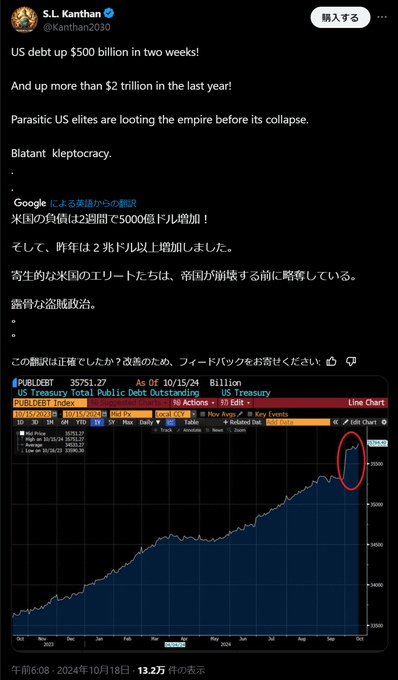 たった17日程度で5000億ドル(約75兆円相当)の負債が増加したようです。