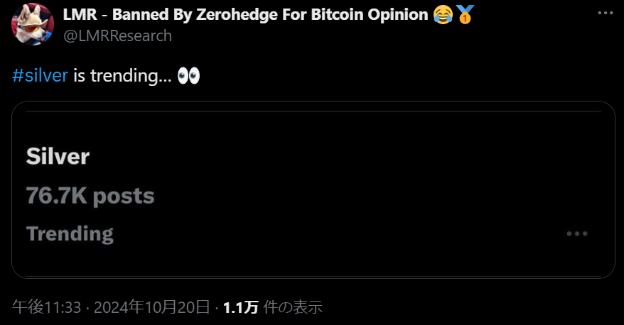 銀価格上昇で海外ではSilverがトレンド入りした模様。これだけ価格が上昇しても、日本では全然話題にならないですね・・・