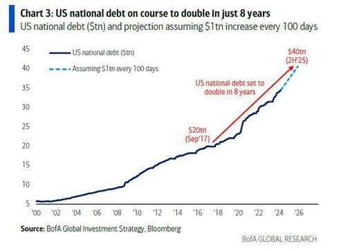 米国の国家債務はわずか8年(2017年後半~2025年後半)で2倍になり、来年後半には40兆ドルに達すると予測されている。