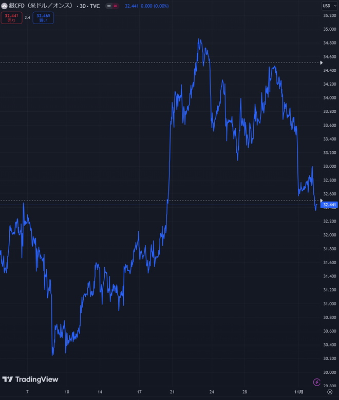 銀に関しても、34.5ドル付近まで回復したと思ったら、再度下落し現在は32.44ドル。