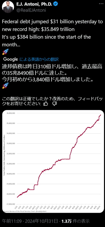 4,米連邦債務は310億ドル増加し、過去最高の35兆8490億ドルに達した