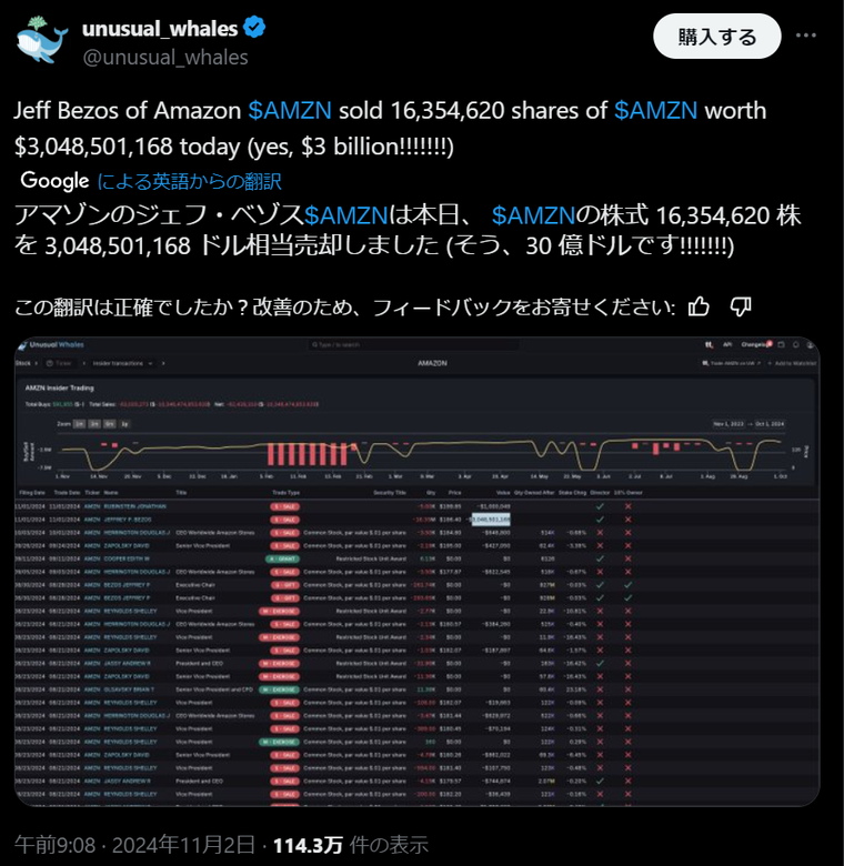Amazonのジェフ・ベゾスが本日、$AMZN 株を16,354,620株売却し、売却額は30億4,850万1,168ドルでした(約4,633億7,217万円です!