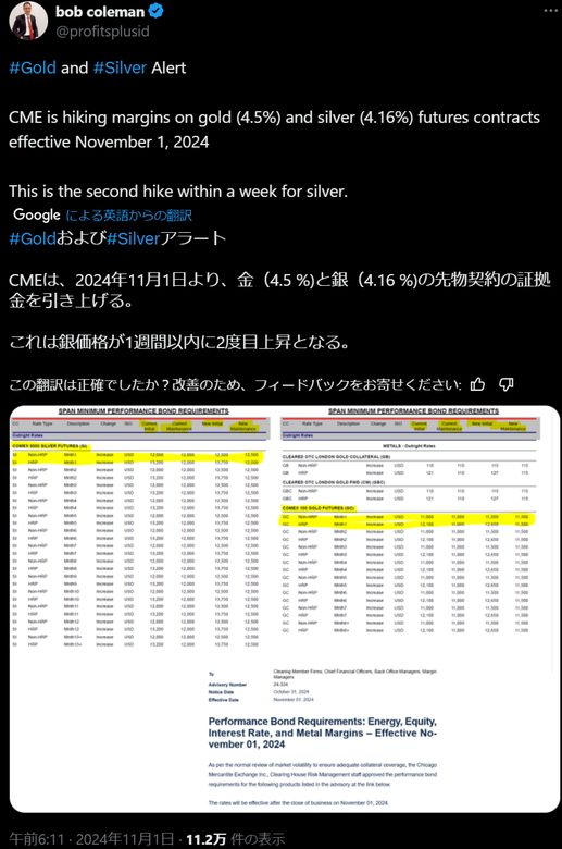 2,CME2024年11月1日より、金(4.5 %)と銀(4.16 %)の先物契約の証拠金を引き上げる。