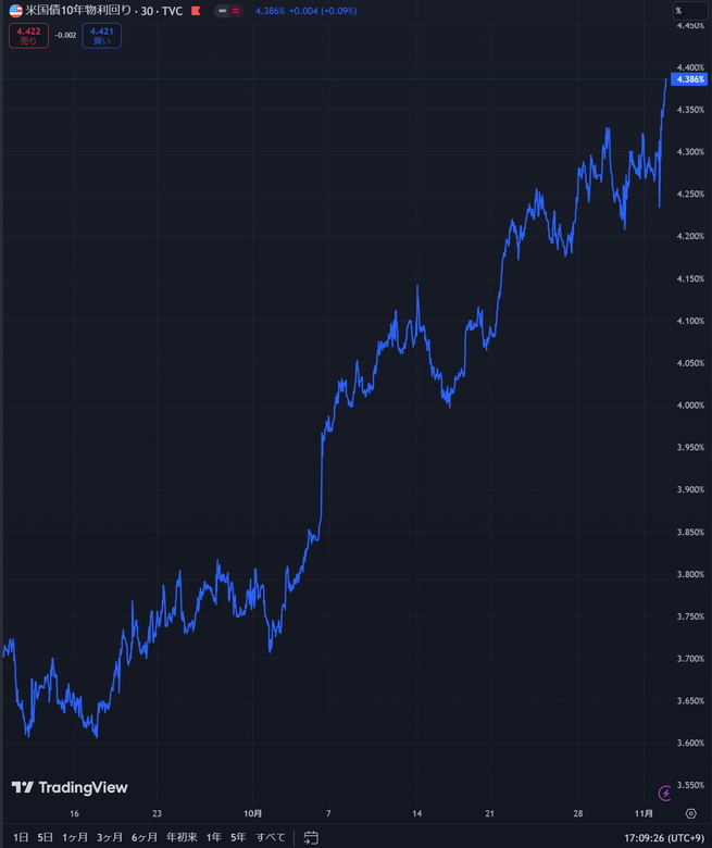 9月18日のFOMCで0.5%の金利引下げがあったにも関わらず、米国債利回りはどんどん上昇し、現在は4.86%です。