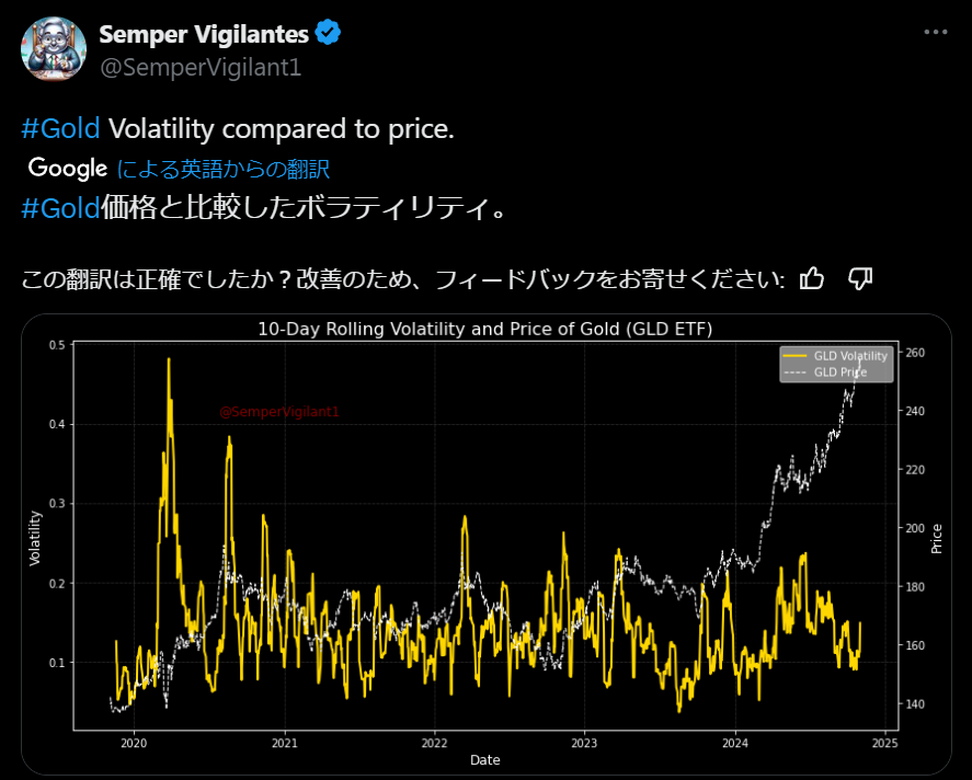 また、Semper Vigilantes氏という恐らく貴金属投資家の中でもトップクラスの分析力である方によると、「金のボラティリティはそれほど多くなっておらず、価格が上昇しているだけ」としてます。