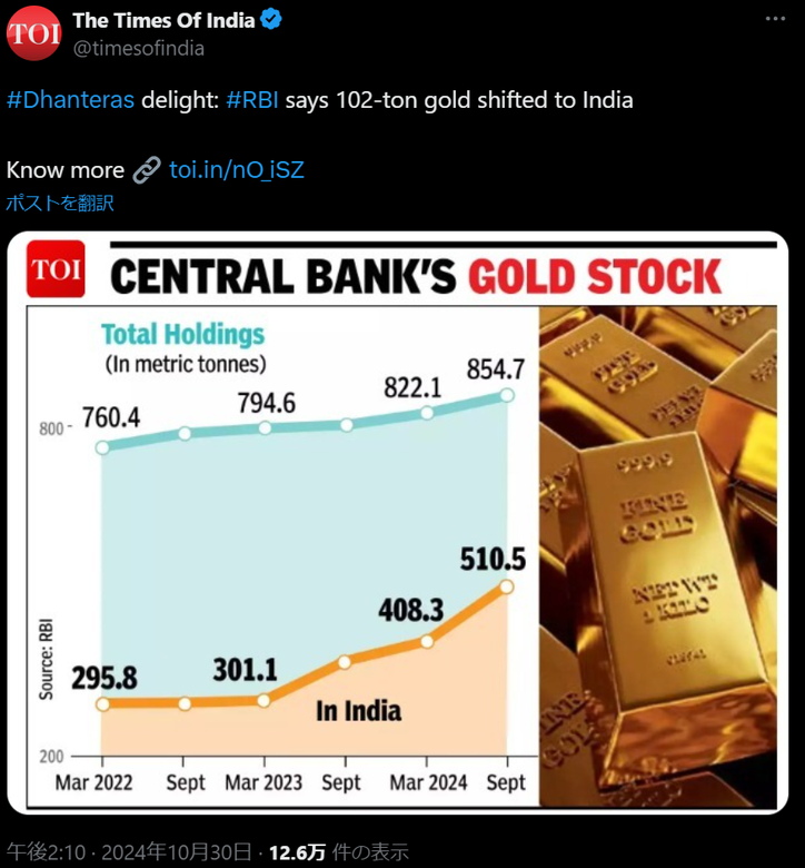2022年9月以降、214トンの金がインドに移送されており、多くの政府関係者は自国で金を保有する方が安全だと考えています。