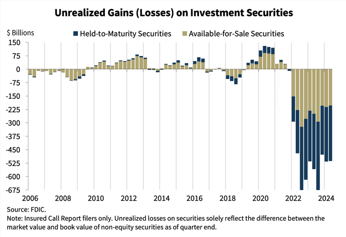 FDIC保険付きの金融機関は2024年第2四半期に5129億ドルの含み損を証券報告しました。これは主に金利の上昇によって引き起こされ、債券に下方圧力をかけた。
