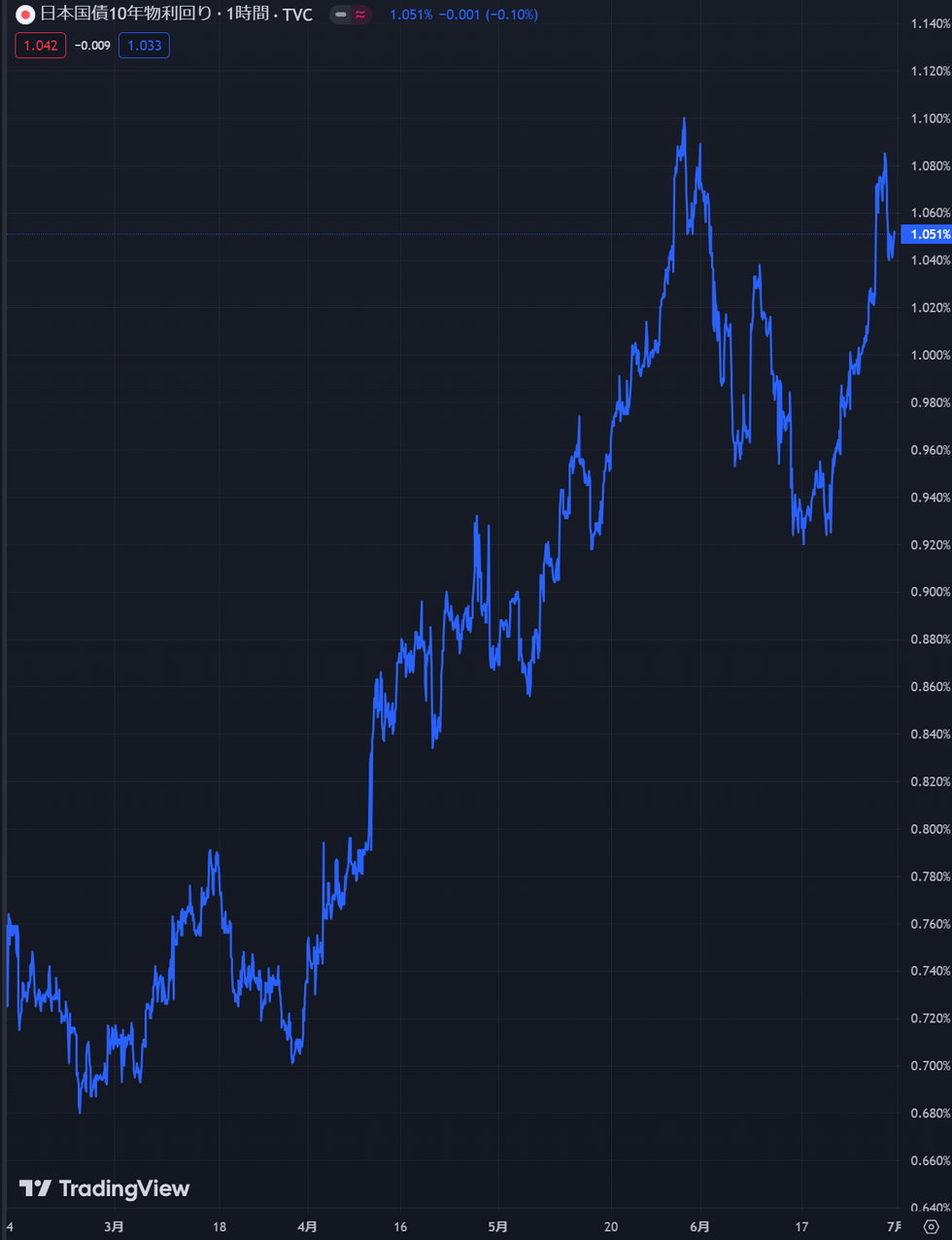 円の下落を止める為には日銀の政策金利を上げる必要がありますが、政策金利も一時1.08%程度まで上昇。