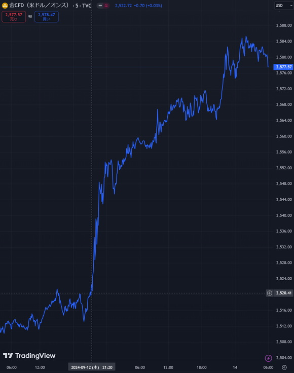 この発言が日本時間9月12日午後2:09なのですが、金が急騰したのは12日の夜21時半のCPI発表後です。