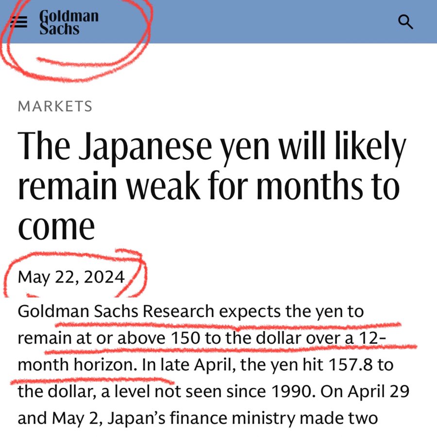 ゴールドマン・サックス( $GS )は、5月の時点で円は今後12か月間、1ドル150円以上の水準で推移する可能性が高いと予想。しかし、円高に向かい円キャリートレードで大きな損失を被ったようです。