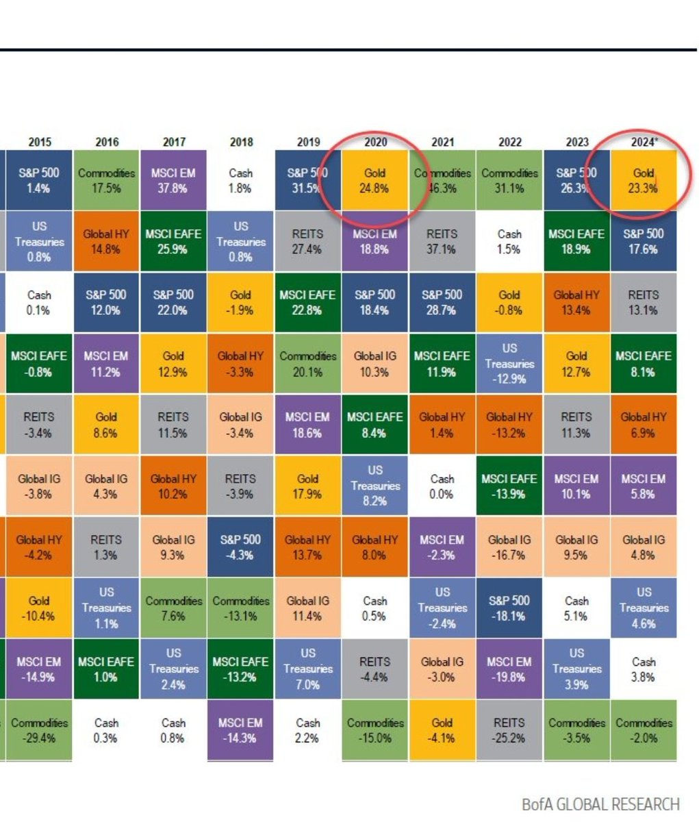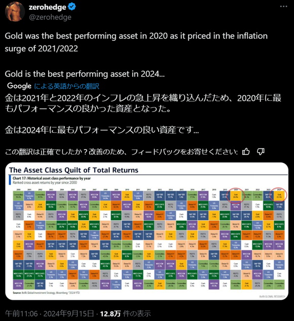 Zerohedgeによると金は2024年S&P500などを超えるパフォーマンスだったようです。